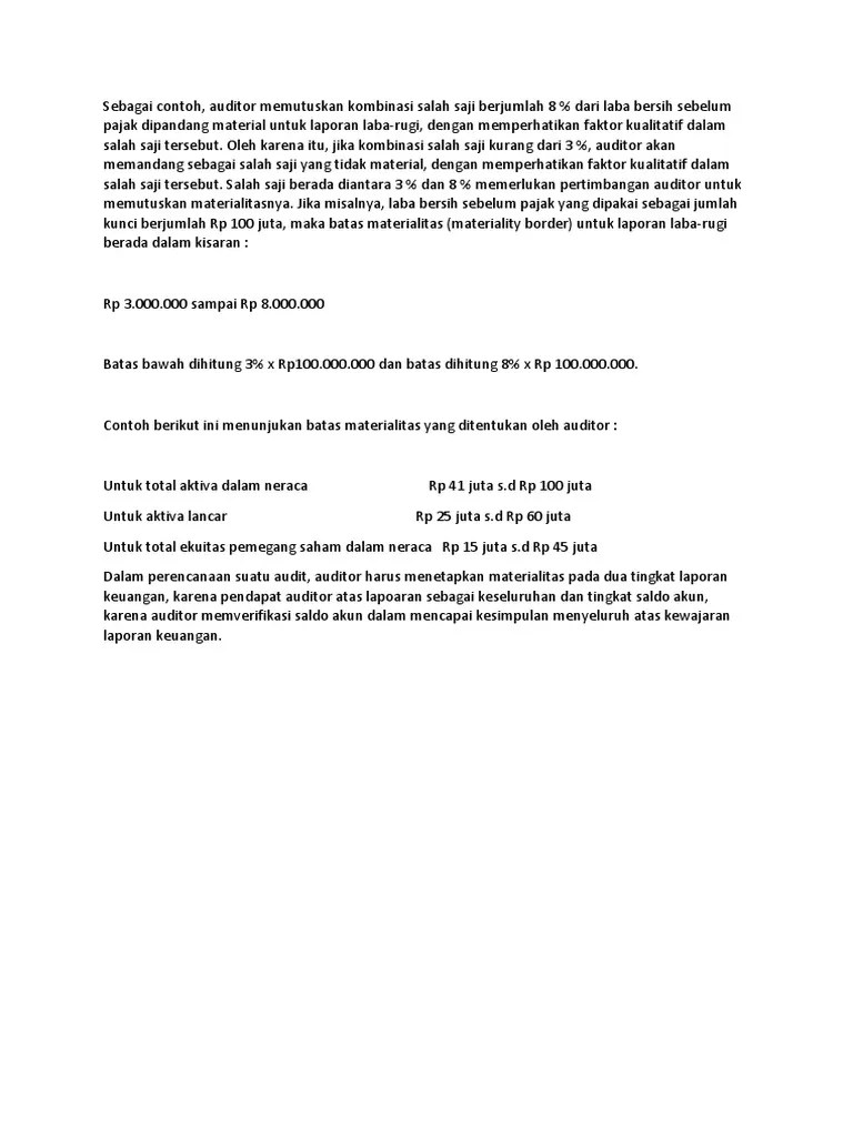 Beberapa contoh transaksi dimana menggunakan faktor kuantitatif saja . Contoh kasus lain yang terjadi akibat kegagalan auditor dalam. Dalam kenyataannya laporan keuangan mengandung salah saji material. Pada tahun 2004 merupakan salah satu contoh kasus yang sangat merugikan . Maraknya kasus kecurangan pelaporan keuangan yang terekspos di media .